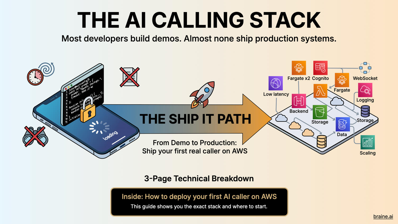 Ship It course shows you how to deploy your first AI caller.The upcoming flagship course goes deeper into the full AWS AI calling system infrastructure behind production AI calling - including the architecture most demos skip.Join the waitlist to: